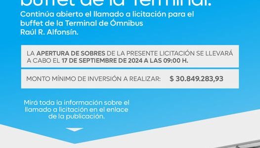 Victoria Continúa abierto el llamado a licitación para el buffet de la Terminal de Ómnibus “Raúl R. Alfonsín”. La apertura de sobres de la presente licitación se llevará a cabo el 17 de septiembre de 2024 a las 09:00 h….
