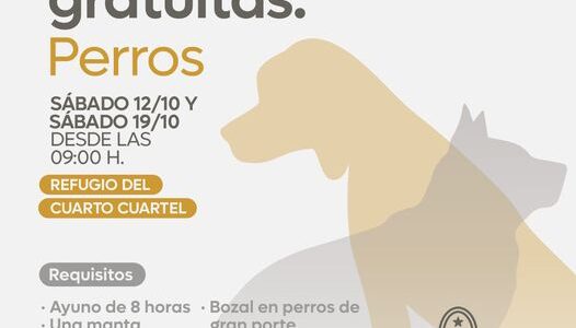 Victoria Continúa la campaña de esterilización canina sin arancel. Se realizará en el Refugio del Cuarto Cuartel ( Perú, entre Sarmiento y Bartoloni) el sábado 12 y el sábado 19 de octubre a partir de las 09:00 h. Con la…