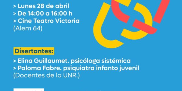 Victoria 28 de abril De 14:00 a 16:00 h Cine Teatro Victoria (Alem 64) Disertantes: • Paloma Fabre, psiquiatra infanto Juvenil. • Elina Guillaumet, psicóloga sistémica. Ambas docentes de la UNR. Se brindarán certificados de asistencia. Inscribite a través del…