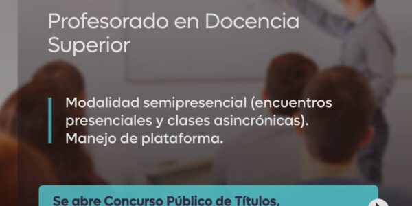 Victoria Profesorado en Docencia Superior Modalidad semipresencial (encuentros presenciales y clases asincrónicas). Manejo de plataforma. Se abre el Concurso Público de Títulos, Antecedentes y Oposición para cubrir espacios del Primer Trayecto: • Política, sistema y planeamiento institucional • Psicología del…