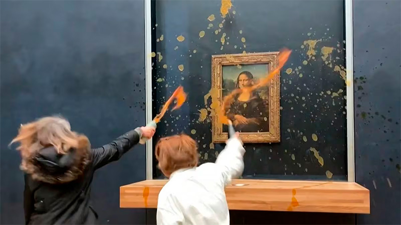 “La Gioconda”, considerado el lienzo más famoso del mundo y también conocido como la Mona Lisa, fue recientemente objeto de otro acto vandálico cuando en mayo de 2022 le arrojaron una torta de crema, pero el grueso cristal que la protege evitó que sufriera daños.