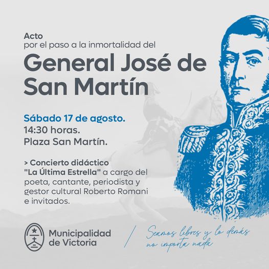 La Municipalidad de Victoria organiza el acto oficial en conmemoración de un nuevo aniversario del fallecimiento del General Dn. José de San Martín. Se realizará el