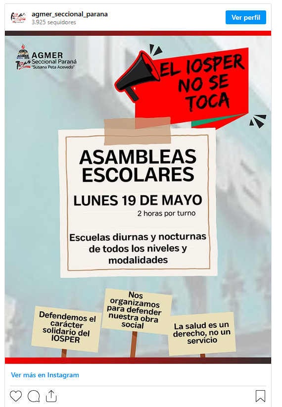 La iniciativa surge en el marco del estado de alerta y movilización que el gremio declaró, junto con la Intersindical en Defensa del Iosper, ante el proyecto que propone disolver la obra social. “Es fundamental la discusión y la participación en defensa de nuestro derecho a la salud y de una obra social solidaria”, expresó Agmer Paraná en un comunicado.
