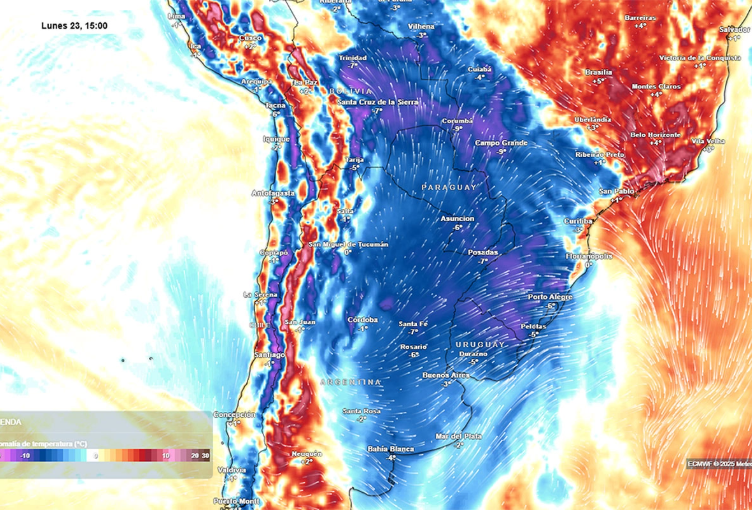 Durante la segunda mitad de la semana, el descenso térmico alcanzará también a países limítrofes. En zonas Uruguay, del sur de Paraguay y del sur de Brasil podrían registrarse valores negativos entre martes y miércoles, lo que resalta la intensidad y extensión de esta masa de aire frío.