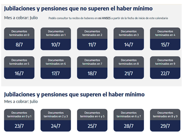 Para jubilaciones y pensiones que no superen el haber mínimo, el calendario de pagos es el siguiente: