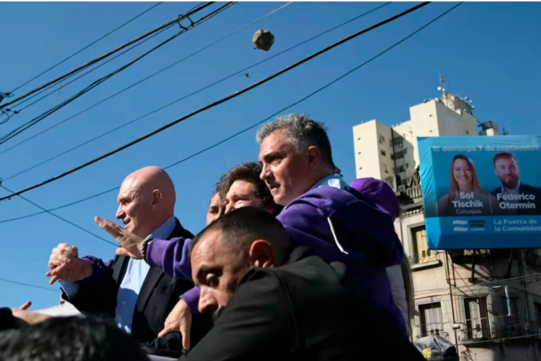 El candidato a senador de la Tercera Sección Electoral por La Libertad Avanza, Maximiliano Bondarenko, también resultó alcanzado por una pedrada durante el episodio.