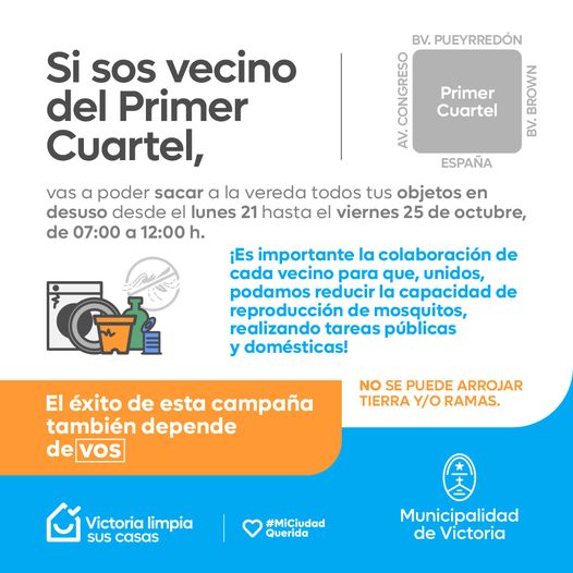 Si sos vecino del Primer Cuartel, ¡esta semana vas a poder sacar a la vereda todos tus objetos en desuso desde el lunes 21 hasta el viernes 25 de octubre, de 07:00 a 12:00 h!