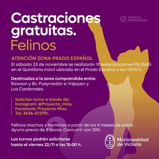El sábado 23 de noviembre se realizarán 10 esterilizaciones felinas en el Quirófano móvil ubicado en el Prado Español a las 13:00 h.