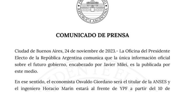 Rumbo al 1o de diciembre La oficina del presidente electo Javier Milei confirmó las designaciones de los titulares de ANSES y de YPF. En tanto, ratificó que “ante los falsos rumores difundidos, el cierre del Banco Central no es un…