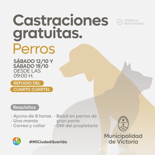Continúa la campaña de esterilización canina sin arancel. Se realizará en el Refugio del Cuarto Cuartel ( Perú, entre Sarmiento y Bartoloni) el sábado 12 y el sábado 19 de octubre a partir de las 09:00 h.