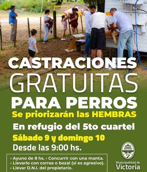 Desde la Municipalidad de Victoria se continúan realizando castraciones sin arancel. En esta ocasión se dará prioridad a perras. Las castraciones se harán en el Refugio del Quinto Cuartel este sábado 9 y domingo 10 a partir de las 09:00.