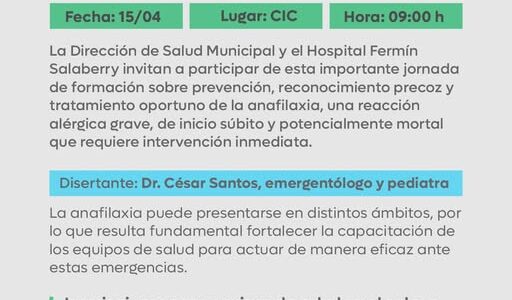 Victoria Destinada a equipos de salud. La Dirección de Salud Municipal y el Hospital Fermín Salaberry invitan a participar de esta importante jornada de formación sobre prevención, reconocimiento precoz y tratamiento oportuno de la anafilaxia, una reacción alérgica grave, de…