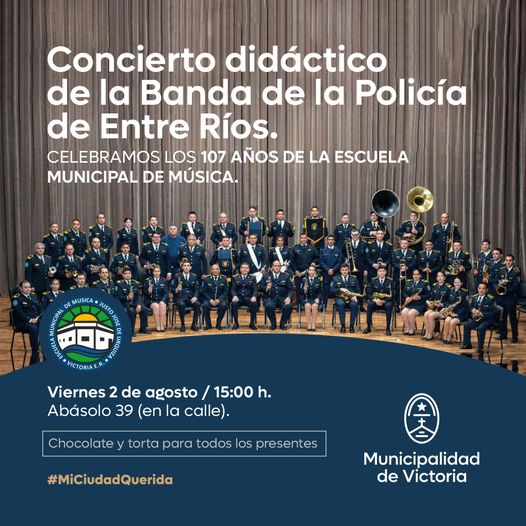 Vamos a festejar el aniversario de la Escuela Municipal de Música “Justo José de Urquiza” con un acto oficial, concierto didáctico de la Banda de la Policía de Entre Ríos, actuación de egresados de la institución y chocolate y torta para todos los presentes. Va a ser el viernes 2 de agosto a las 15:00 h en Abásolo 39.