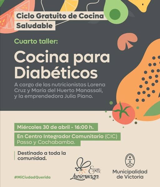 Vamos a realizar el cuarto taller libre y gratuito del ciclo, denominado “Cocina para Diabéticos”, el miércoles 30 de abril a las 16:00 h en el CIC ( Cochabamba y Passo). Desde la Municipalidad de Victoria continuamos desarrollando propuestas de calidad para nuestra comunidad.