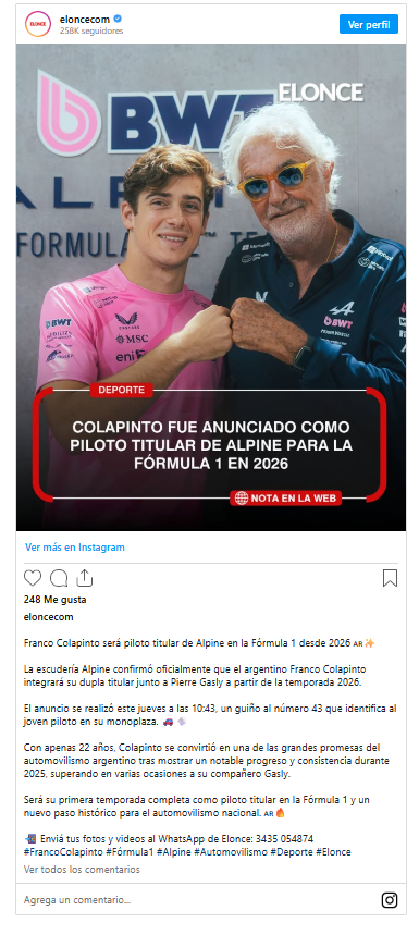 Colapinto fue anunciado como piloto titular de Alpine para la Fórmula 1 en 2026