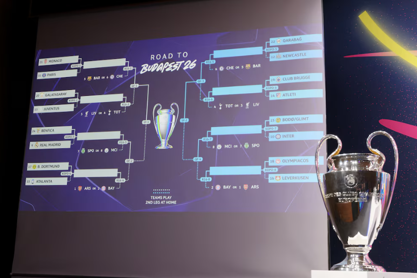 La gala, que se desarrolló en la Casa del Fútbol Europeo en Nyon, Suiza, determinó cómo se repartieron las bolillas. El primer emparejamiento puso cara a cara al Borussia Dortmund de Alemania con el Atalanta, por lo que Olympiakos de Grecia se verán las caras contra el Bayern Leverkusen. Los vencedores de estas llaves se medirán en octavos de final (el sorteo será el 27 de febrero) ante Arsenal de Inglaterra o Bayer Munich de Alemania.