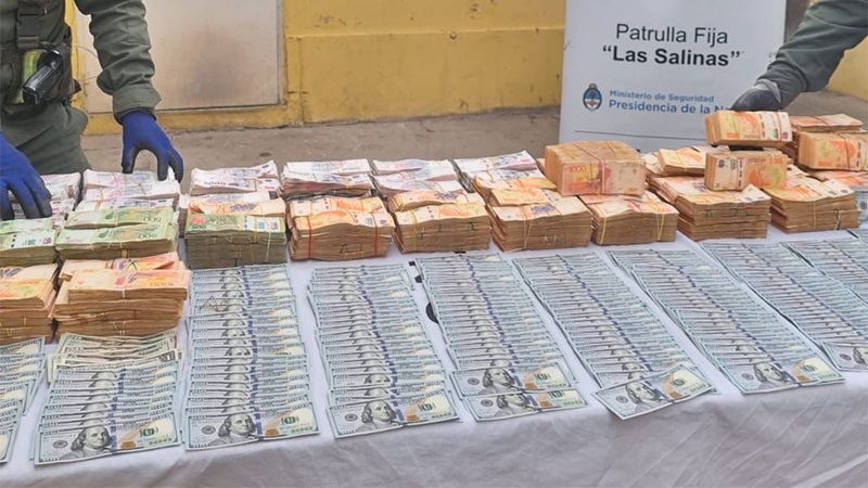 Posteriormente, “y con el apoyo de personal de la Unidad de Criminalística y Estudios Forenses, se contabilizó un total de 39.019.400 pesos argentinos y 27.017 dólares estadounidenses”, informó Gendarmería.