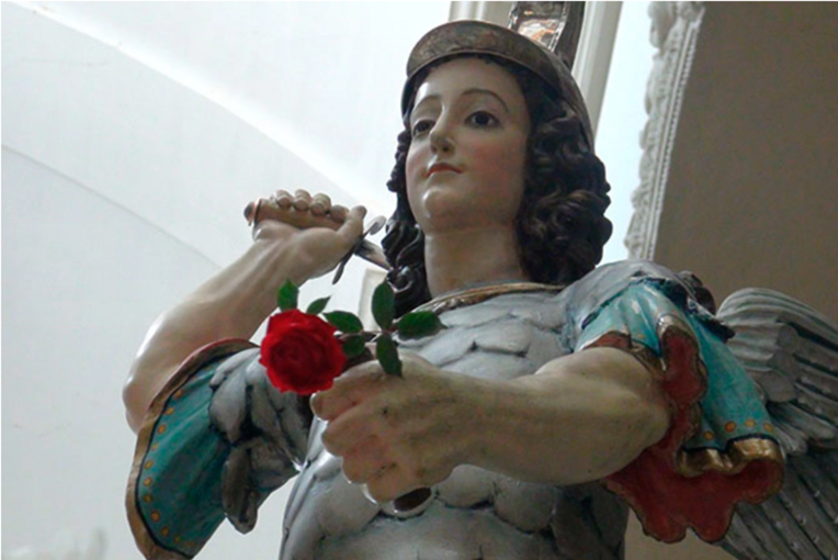 Este arcángel es conocido por enfrentarse al Dragón, que simboliza a Lucifer, el enemigo de la fe. También suele representarse como un santo con armadura y espada, luchando contra una serpiente, que es el símbolo del mal.