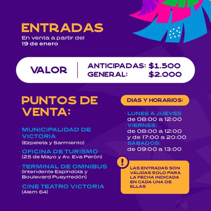 El valor de las entradas será de 1.500 pesos cada una (compra anticipada), y 2.000 pesos en boleterías del circuito. Las entradas son válidas solo para la fecha indicada en cada una de ellas.