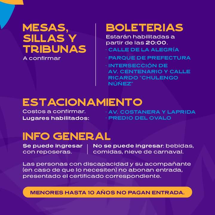 Se puede ingresar con reposeras. No se puede ingresar con bebida, comida, nieve de carnaval.