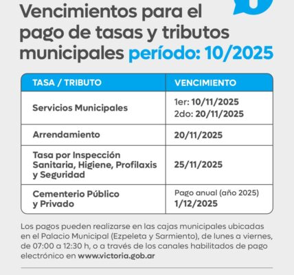 Locales Venicimientos para el pago de Tasas y Tributos Municipales Período 10/2025 Victoria Al Día 06/11/2025