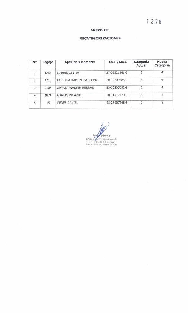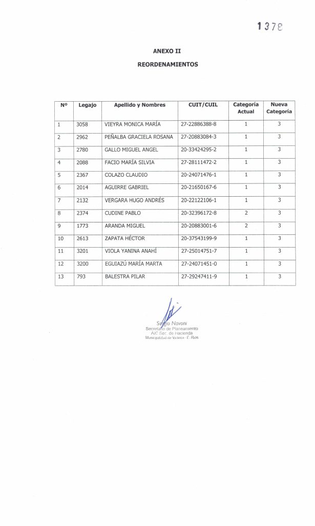 El presidente municipal, Domingo Maiocco, y el secretario de Hacienda, Sergio Navoni, firmaron el Decreto nro. 1378 que dispone, además de los ingresos a la planta estable de la Municipalidad de Victoria, un listado con recategorizaciones y reordenamientos en el escalafón municipal que puede llegar a generar diferencias con los gremios, y la gestión que asumirá el 10 de diciembre. Fuente: lt39noticias.com.ar