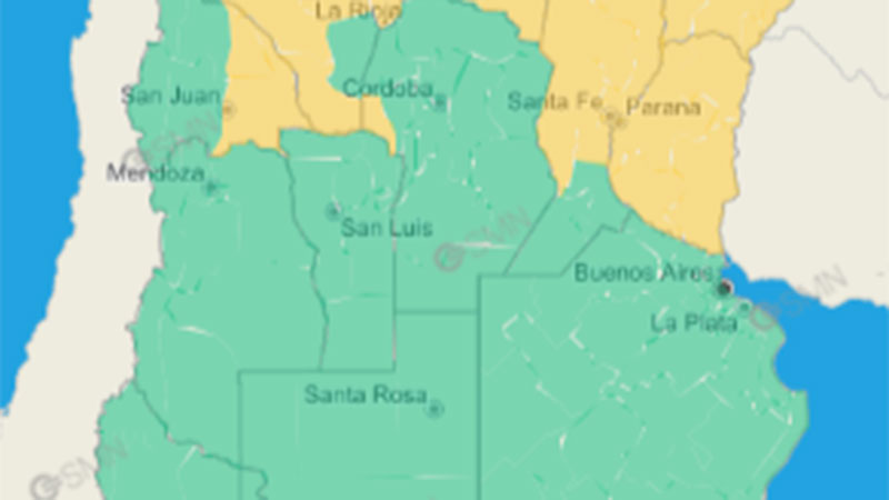 Bajo alerta amarilla se encuentran las provincias de Santa Fe, Buenos Aires, Río Negro, La Pampa, Mendoza, San Luis, Córdoba, Santiago del Estero, Formosa, Chaco y Salta. El SMN indica que “el área será afectada por tormentas, algunas localmente fuertes. Las mismas estarán acompañadas por fuerte actividad eléctrica, ráfagas intensas, ocasional caída de granizo y abundante caída de agua en cortos períodos”. Además, se estiman