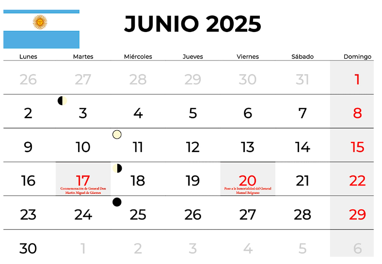 Entre el sábado 14 y el lunes 16 habrá un fin de semana largo, ya que se traslada el feriado del 17 por el Paso a la Inmortalidad del General Martín Miguel de Güemes. Además, esa misma semana habrá otro descanso extendido, del viernes 20 al domingo 22 de junio, en homenaje a Manuel Belgrano.