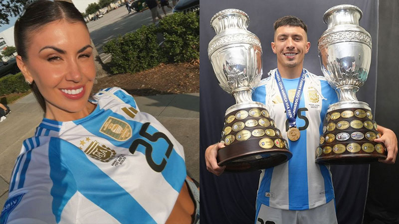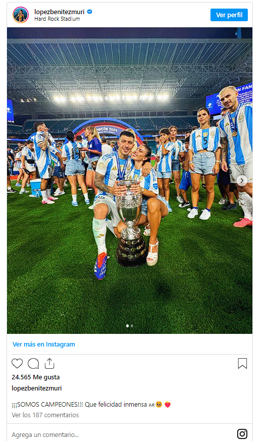 “Qué felicidad inmensa”, expresó Muri López Benítez en una foto junto al futbolista entrerriano y el trofeo de la Copa América. Y el futbolista le dejó un mensaje manifestándole todo su amor.