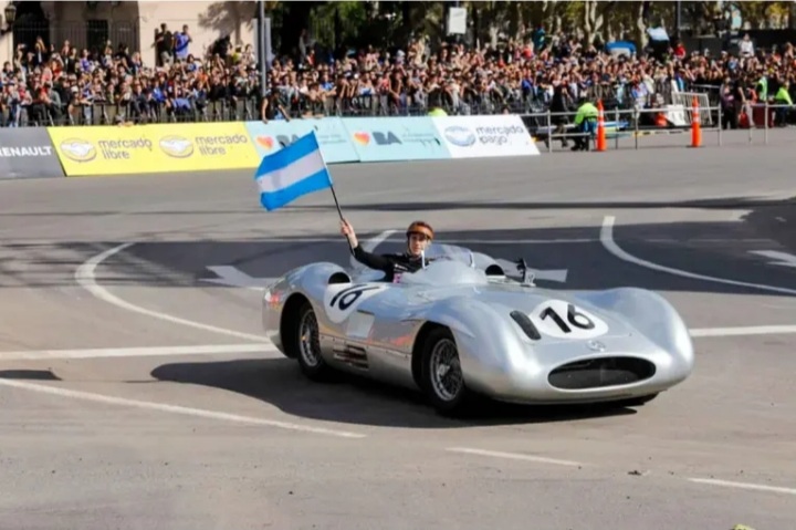Más tarde, el piloto se subió a una réplica del Mercedes-Benz W196, recordado por haber sido conducido por Juan Manuel Fangio. Ese momento fue uno de los más destacados de la jornada por el simbolismo que representa para el automovilismo nacional.