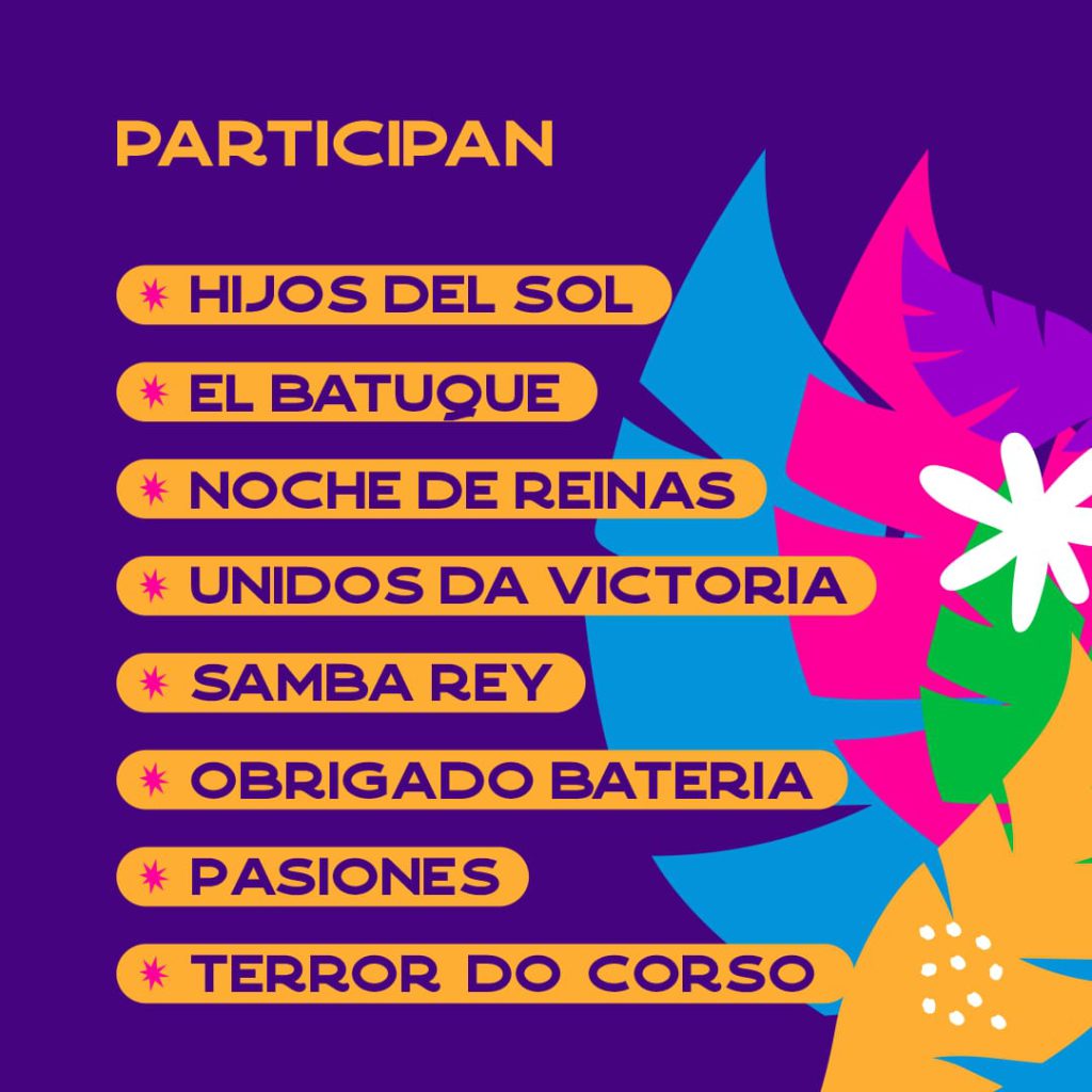 Las expresiones que desfilarán en el espectáculo serán Hijos del Sol, El Batuque, Noche de Reinas, Unidos Da Victoria, Samba Rey, Obrigado Batería y Pasiones. Además, participará Terror do Corso. Fuente: lt39noticias