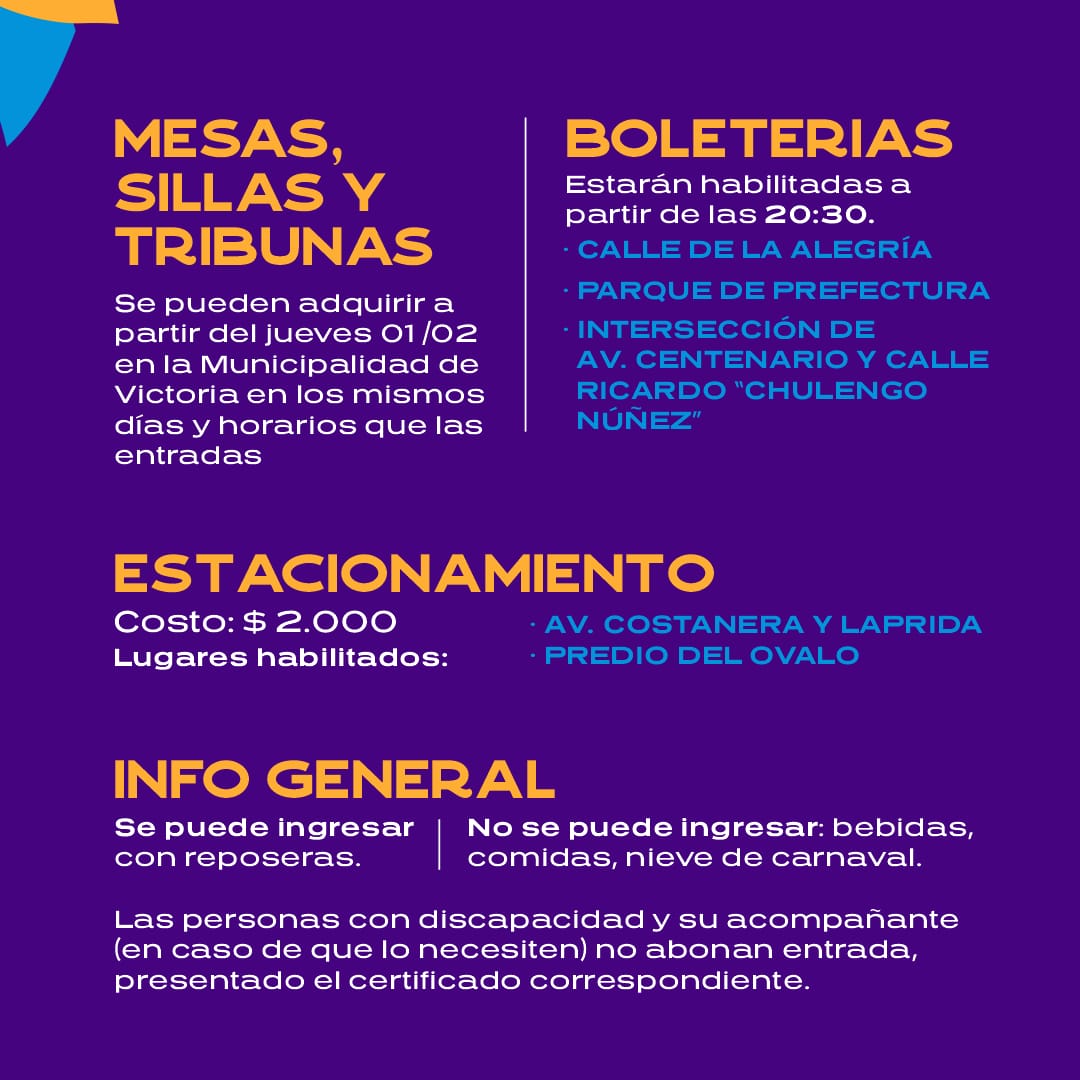 Las boleterías del circuito estarán habilitadas a partir de las 20:30, en los siguientes ingresos: Calle de la Alegría, Parque Prefectura, e Intersección de Avenida Costanera y Calle Ricardo “Chulengo” Núñez.