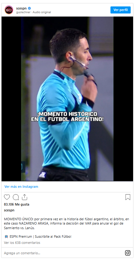 Tras verificar la jugada en el monitor, Arasa confirmó el fuera de juego y, por primera vez, explicó su fallo a través de su intercomunicador: “Luego del chequeo VAR, informo que hay posición de fuera de juego en la fase de ataque. Reanudo con tiro libre indirecto, a favor del equipo defensor”.