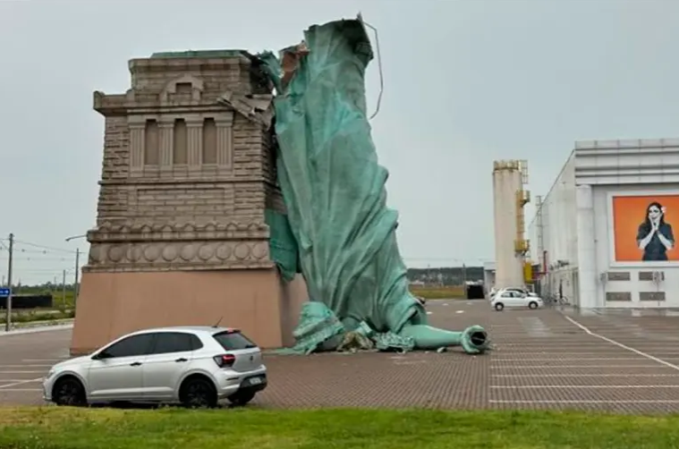 La réplica de la Estatua de la Libertad, de 35 metros de altura, fue derrumbada este lunes por vientos de hasta 90 kilómetros por hora en un estacionamiento en Porto Alegre, sur de Brasil.