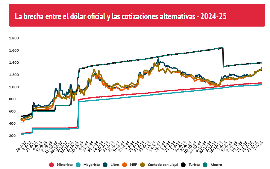 El dólar libre ganó 35 pesos o 2,7% este lunes, para terminar a $1.345 para la venta, el precio más elevado desde el 26 de agosto del año pasado. En lo que va de 2025, la divisa informal progresa 115 pesos o un 9,3%, por encima de la inflación del período. Con un dólar mayorista que finalizó sin variantes, a $1.076, la brecha cambiaria se amplió a 25%, la más grande desde el 22 de octubre del año pasado (26%).