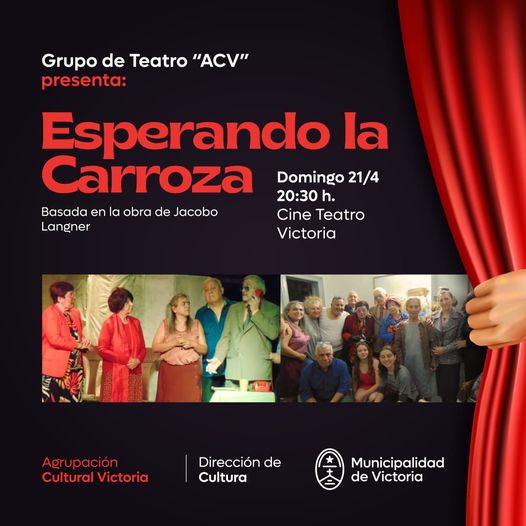 Este domingo 21 de abril llega al Cine Teatro Victoria “Esperando la Carroza”. Esta actividad se realiza de forma conjunta entre la Municipalidad de Victoria y la Agrupación Cultural Victoria. El valor de la entrada es a colaboración para el Grupo “ACV”.