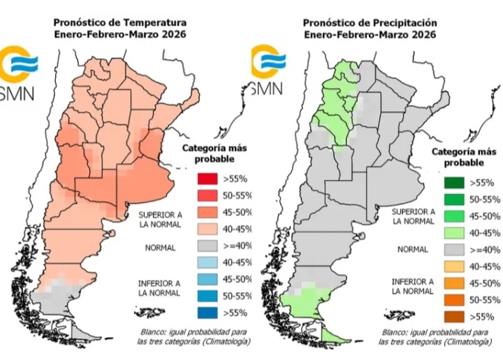 El informe al que tuvo acceso Elonce se indica que “el pronóstico de consenso para enero- febrero-marzo”, en cuanto a temperaturas estima mayor probabilidad de ocurrencia de temperaturas medias superiores a lo normal en la región de Cuyo, La Pampa, Buenos Aires y sur del Litoral.