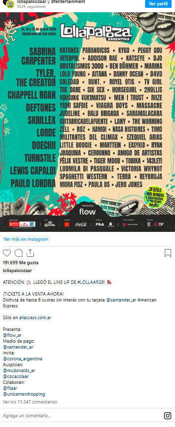 Las entradas para Lollapalooza Argentina 2026 sólo se pueden conseguir en la web de AllAccess con preventa para Tarjeta AMEX del Banco Santander en hasta seis cuotas sin interés. Fuente: El Once