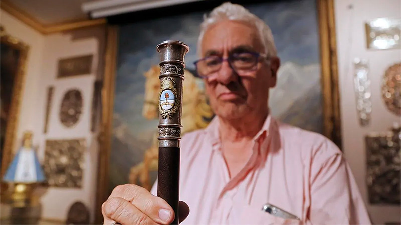 El primer bastón presidencial que hizo Juan Carlos Pallarols fue en 1973, cuando trabajaba como orfebre para una tradicional joyería de Buenos Aires. Fue un encargo para el último mandato del tres veces presidente Juan domingo Perón, fallecido en 1974. Su viuda, la también mandataria Estela Martínez, lo puso en venta años después y Pallarols lo compró. Lo atesora en su taller entre decenas de obras de arte, cuadros, bustos, coronas de plata y reliquias. El diseño es muy diferente del actual, con borlas doradas, empuñadura en oro, madera lustrada de malaca y ornamentación “propia de un bastón europeo”, esgrime.