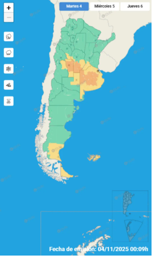El frente frío avanzará desde el sur hacia el norte del país, afectando a Cuyo, el Litoral y posteriormente al norte argentino. Estará acompañado por un aumento de la nubosidad, lluvias intermitentes y chaparrones, especialmente sobre el área pampeana y las zonas agrícolas del centro.