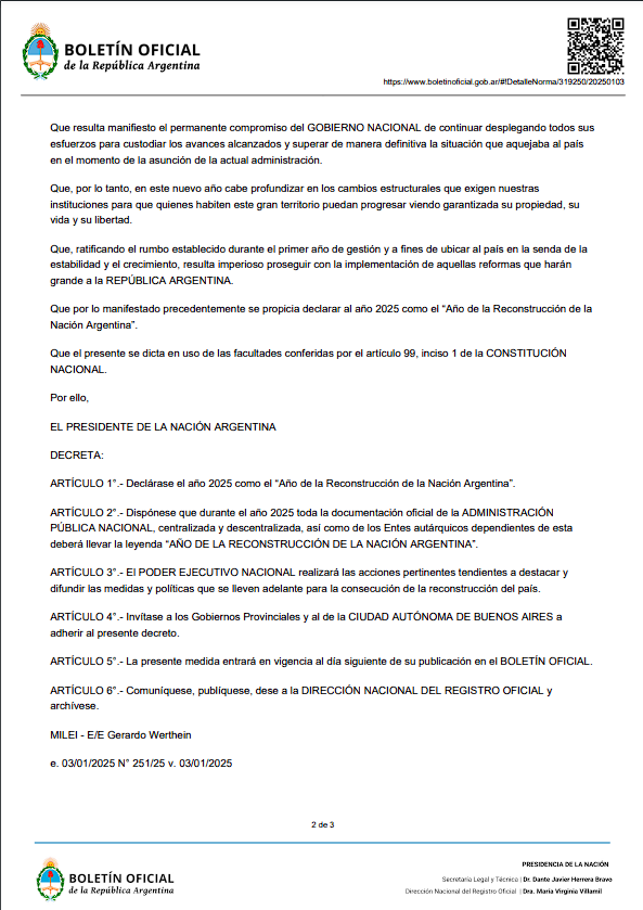 ARTÍCULO 2°.- Dispónese que durante el año 2025 toda la documentación oficial de la ADMINISTRACIÓN PÚBLICA NACIONAL, centralizada y descentralizada, así como de los Entes autárquicos dependientes de esta deberá llevar la leyenda “AÑO DE LA RECONSTRUCCIÓN DE LA NACIÓN ARGENTINA”.