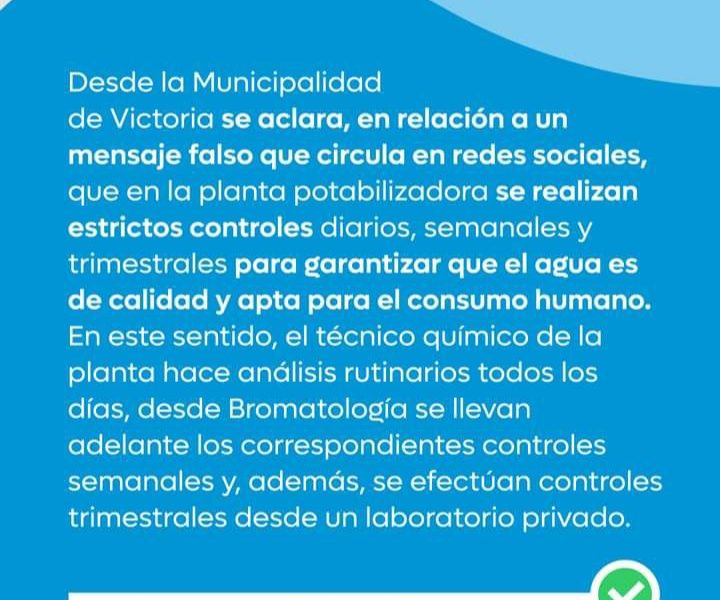 Desde la Municipalidad de Victoria se aclara, en relación a un mensaje falso que circula en redes sociales, que en la planta potabilizadora se realizan estrictos controles diarios, semanales y trimestrales para garantizar que el agua es de calidad y apta para el consumo humano. En este sentido, el técnico químico de la planta hace análisis rutinarios todos los días, desde Bromatología se llevan