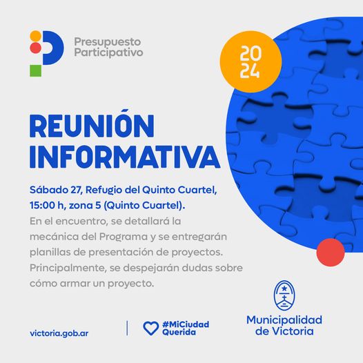 Vamos a realizar otra reunión informativa del Presupuesto Participativo. Va a ser el sábado 27 a las 15:00 h, en el Refugio del Quinto Cuartel, zona 5 (Quinto Cuartel).