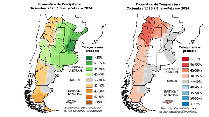 El informe al que tuvo acceso Elonce se indica que “el pronóstico de consenso para diciembre-enero-febrero”, en cuanto a las precipitaciones prevé mayor probabilidad de ocurrencia de lluvias superiores a las normales sobre la región del Litoral (incluida Entre Ríos) el Norte, Córdoba, oeste de Santa Fe, este de San Luis, este de La Pampa y Buenos Aires..