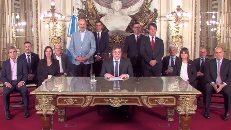En la cadena nacional, junto al presidente Javier Milei estuvieron presentes Luis Caputo, Ministro de Economía; Luis Petri, Ministro de Defensa; Sandra Pettovello, Ministra de Capital Humano; Guillermo Ferraro, Ministro de Infraestructura; Federico Sturzeneger, Asesor de Presidencia de la Nación.; Eduardo Chirillo, Secretario de Energía; Javier Herrera Bravo, Secretario Legal y Técnico; Nicolas Posse, Jefe de Gabinete; Mariano Cúneo Libarona, Ministro de Justicia; Patricia Bullrich, Ministra de Seguridad; y Mario Russo, Ministro de Salud. Fuente: El Once