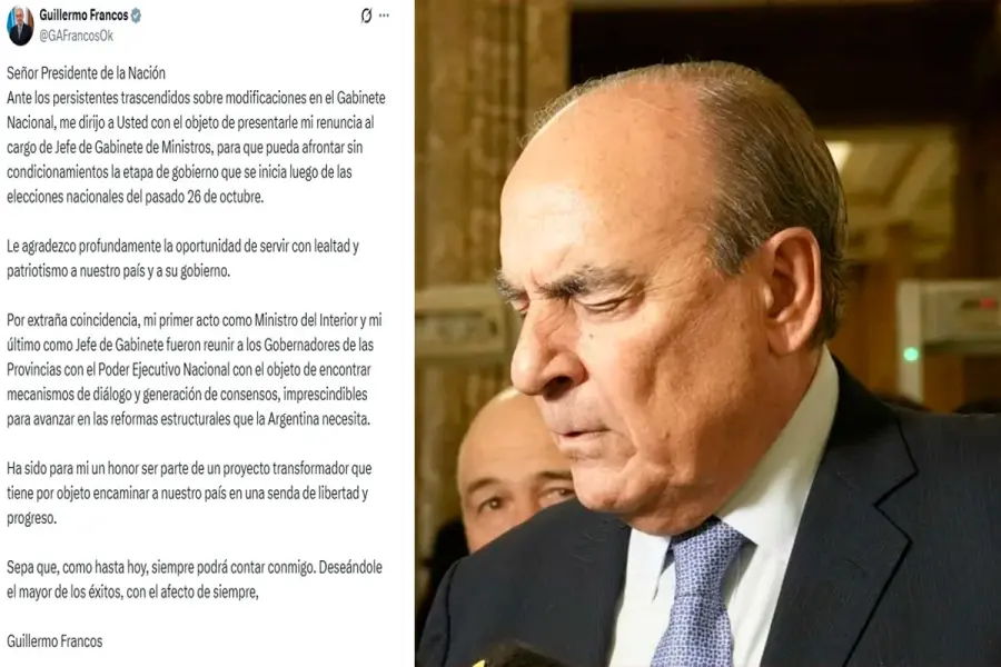 El propio Francos confirmó su renuncia indeclinable al cargo, a través de una carta pública dirigida al presidente Javier Milei, en la que atribuyó su decisión a los “persistentes trascendidos sobre modificaciones en el Gabinete Nacional”.