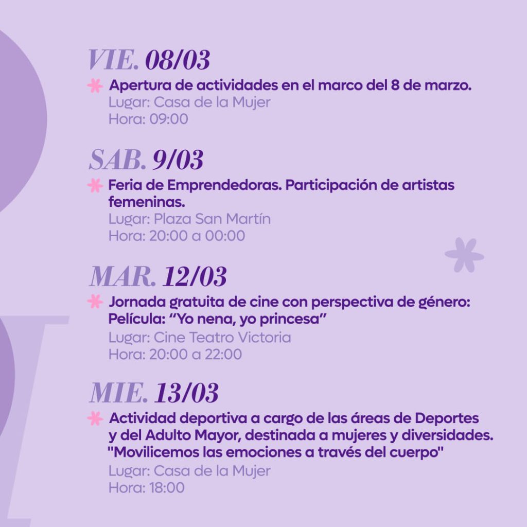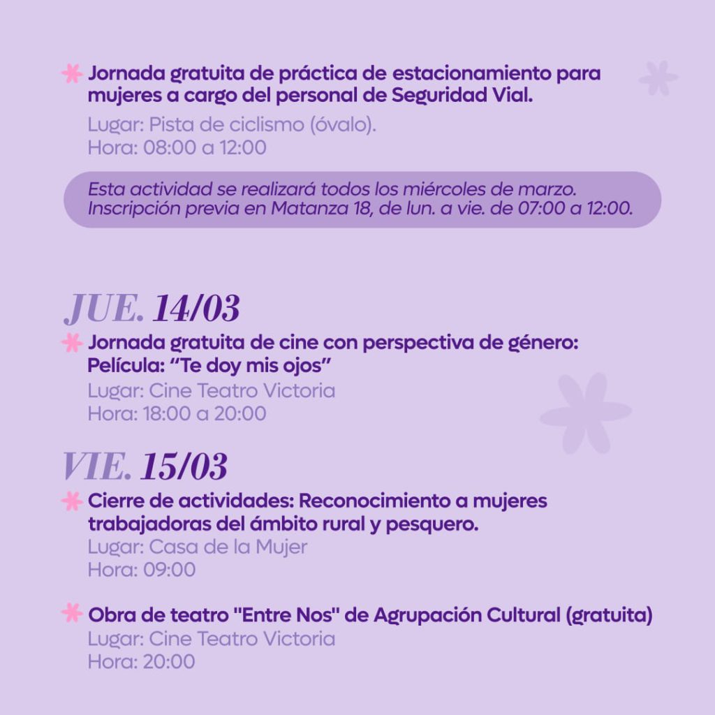 La agenda de actividades organizadas incluye feria de emprendedoras; jornada gratuita de cine; actividades deportivas, jornada gratuita de práctica de estacionamiento, reconocimiento a trabajadoras rurales y pescadoras; y una obra de teatro gratuita.Fuente:lt39noticias