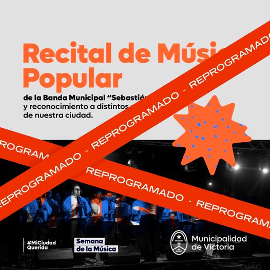 Debido a pronósticos desfavorables del tiempo, se reprograma el recital de música popular de la Banda Municipal “Sebastián Ingrao” que se iba a realizar hoy. La semana que viene se comunicará la nueva fecha, lugar y horario del espectáculo musical.