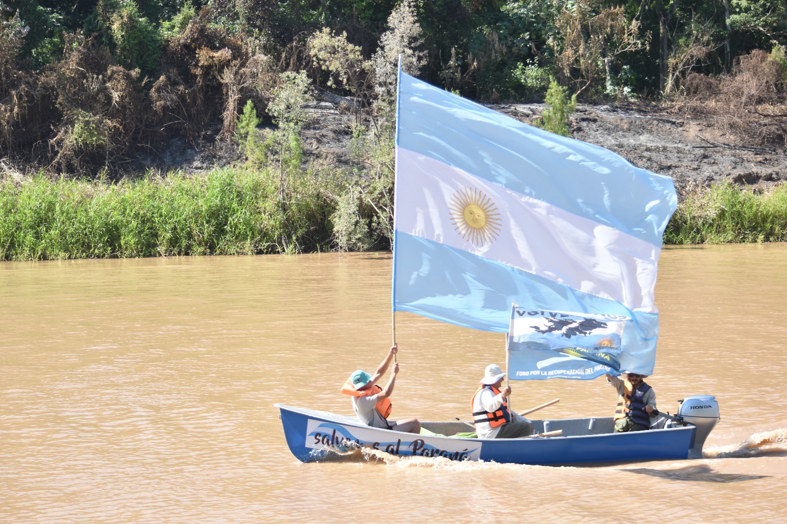 Los presentes entonaron el Himno Nacional argentino acompañados por Ernesto Marval, músico y remero de “la del Zurdo”, quien acompañó con su trombón generando el momento más emotivo de la mañana. Fueron de la partida remeros locales, la Multisectorial de los Trabajadores del Chaco, Escuela de Canotaje Rubén Cotto, Representantes de la Universidad Nacional del Chaco y la facultad de Arquitectura, Movimiento de Cuidadores de la Casa Común, Foro por la Recuperación del Paraná, representantes de las dos CTA, ATE, UPCP (trabajadores estatales de Chaco), la UOM de Acindar de Villa Constitución, CCC, CEPA, entre otros.