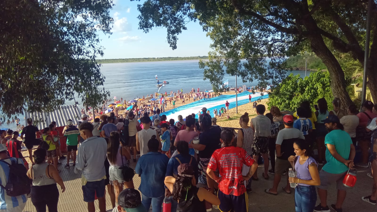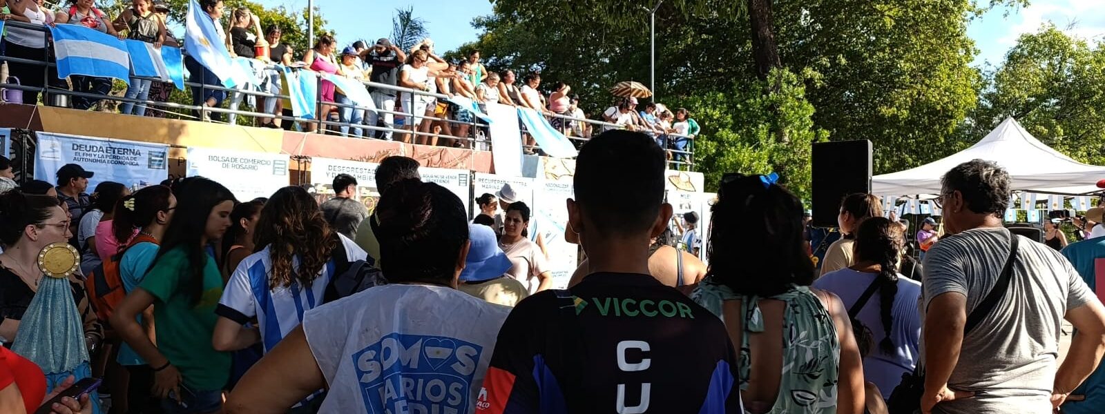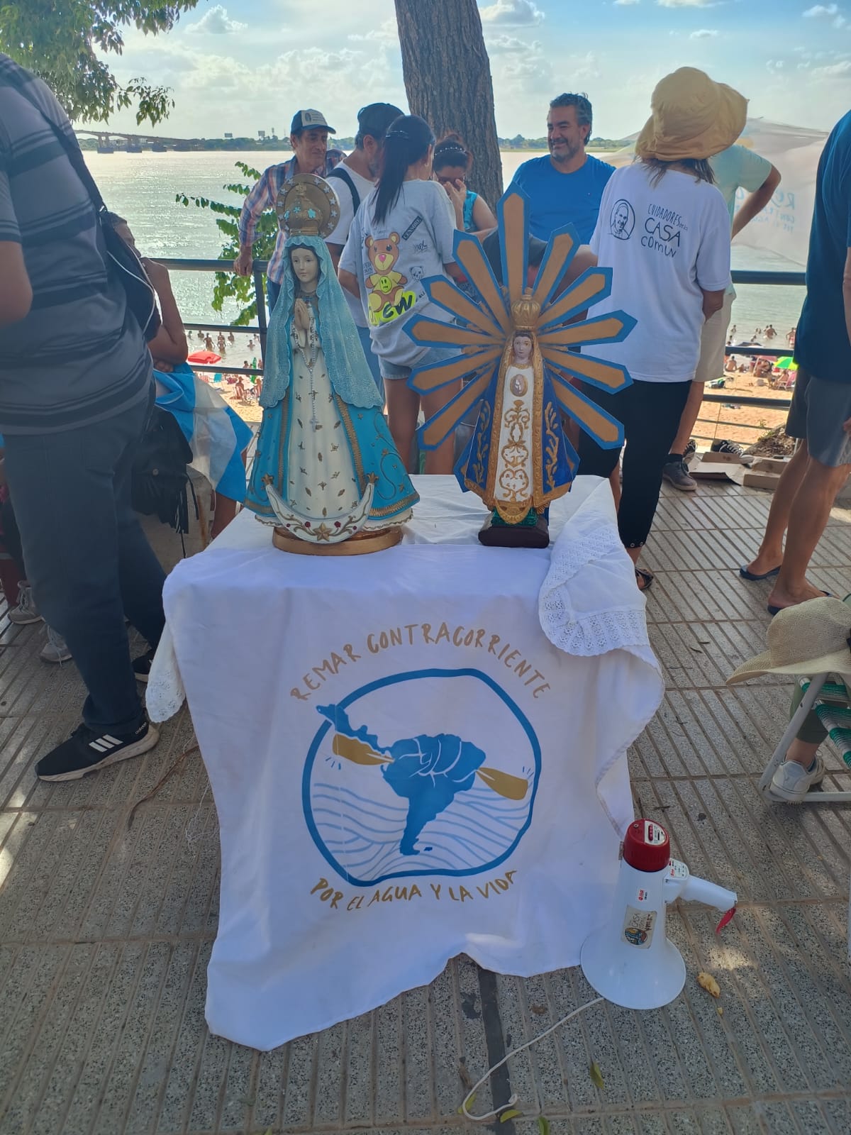 Por la tarde, los remeros llegaron a la playa “Islas Malvinas” de la ciudad de Corrientes donde fueron recibidos por organizaciones de trabajadores, ambientalistas, ex combatientes, deportistas, trabajadores de la economía Social, referentes locales de la cultura, movimientos sociales y vecinos y vecinas de Corrientes. Estuvo dando la bienvenida también el cura Carlitos Gómez, de Curas de Opción por los Pobres (OPP), quien bendijo a las embarcaciones y a los remeros junto a la imagen de la Virgen de Itatí y la Virgen de Luján. La playa se fue nutriendo de gente y organizaciones que fueron llegando mientras recorrían muestras artísticas y de sensibilización dispuestas en la costanera. Los organizadores locales, en la voz de Rita Meza de la Red Eclesial del Gran Chaco y el Acuífero Guaraní y Nancy Coronel, representante de la CTA de Corriente y Cultura Viva Comunitaria, leyeron un documento expresando el rechazo a la licitación propuesta por el gobierno nacional y el saqueo que se está produciendo a nuestro río y a nuestras comunidades. Describieron con claridad las distintas dimensiones de esta licitación y el impacto ambiental, social, cultural y económico que produciría.